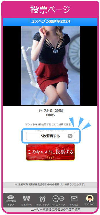 ②.投票するチケット枚数を選択⇒[このキャストに投票する]を押すことでチケット消費と共に投票が完了します。
